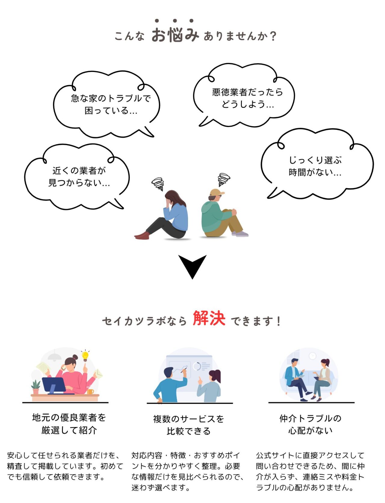 急なトラブルや「どこに頼めばいいかわからない」という悩みを、